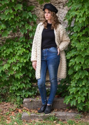 You can find a free version of this pattern on the Hopeful Honey blog here! + DESCRIPTION There's nothing as simple and classic as an oversized cardigan. With inspiration drawn from the peacefulness of a park gently dusted in snow, envelope yourself in the snuggly warmth of the Snow Angel Cardigan; The perfect companion for an early morning stroll amongst towering pines freshly blanketed in frosty coats. Drapey and dramatic, the style of this oversized cardigan adds a touch of warmth and comfort to any outfit, whether outdoors or snuggled up on the couch with a cup of tea. Finished off with a wide collar to match the cuffs, the textured snow-like stitch pattern creates a chic and stylish piece.