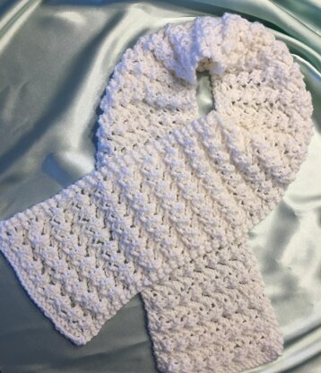 A perfect "wintery white" scarf to wear to all occasions, but particularly pretty for dress up or evening wear. This easy to remember knit pattern almost looks as if it were crocheted! Everyone will want at least one, and most likely two or three, in different Holiday colors. Made with worsted weight yarn, a size 4 yarn, and knitting needles, US #9. This works up rather quickly, so you will be able to make lots of these for all your gift giving problems this year!
