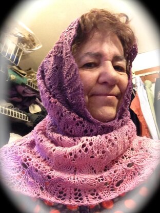 A hooded cowl with a lacy frosty edging around your face and simple snowflakes over your head meeting at your neck with a frosty lace collar. Perfect for gradient dyed yarn.
