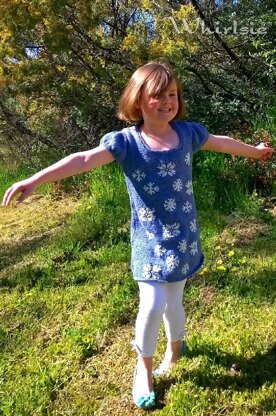 The Snow Dancer dress is knit in pieces with the snowflake motifs being duplicate stitched on later. Designed to be worn as a tunic or a dress, with puffy, cap sleeves. Icord edging gives this close-fitting a-line dress a nice, smooth finish.