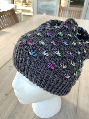 The Snow Flowers hat is a riff on my fun-to-work Seashell Tide hat, but with lots of upgrades! Snow Flowers uses an accent color to made the stitch pattern really pop, and has options for both beanie and slouchy versions, each with sizing from child through adult large, so you can knit this hat for the whole family.