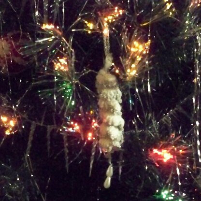This pattern is Super Fast and Super Easy for anyone wanting to make home Christmas Ornaments. It would work well for any winter decoration. Even if the weather doesn't cooperate you can have snow on ice in your home decor. It is uses small amount of either white baby yarn, sport weight or fingering yarn. It also needs small amounts of Silver Crochet Thread size 5. Aluminum hook size C (2.75cm) is also needed. Optional accessories needed are 1 head pin and 2 pearlized drop beads or drop crystal beads for that drip at the end of the icicle. The stitches used are single crochet, half couble crochet, chain and slip stitch. (U.S. terms) Finished size is 7 1/2 inches (19cm) long by 1 inch (2.25cm)wide.