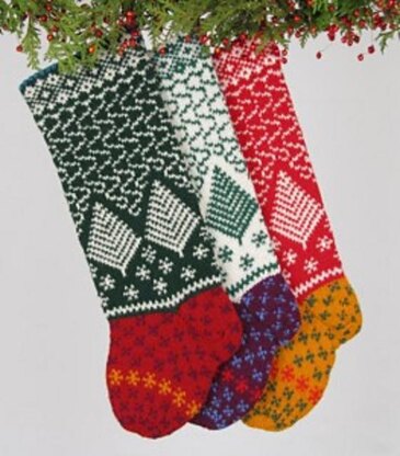 Pattern provides clear written instructions, along with color charts for each colorway, to knit a Christmas stocking in the round.
