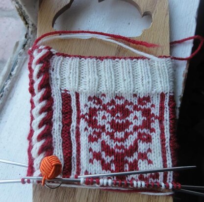 TECHNIQUE NOTES: These socks are stranded color work with a unique two color cast on and a side winding two color cable. These features might seem tricky at first, but most intermediate knitters (and adventurous beginners)should have no problems following the instructions for a very dramatic sock. The right sock and left sock are mirrored as far aa color. Charts are provided for both.