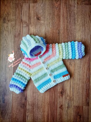 This cute hoodie is made from the neck down, then joining to make the sleeves and hood. It features a bobble puff stitch for the sleeves and hood and could be made as a cardigan without the hood if wanted. It can also be made a bit longer and add pockets if wanted.