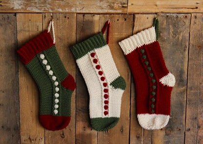 This Snowbobbles Christmas Stocking features beautiful post stitching and bobbles to create a fun cable pattern. They will look gorgeous on any mantle. Make them in traditional, Victorian, or modern Christmas colors or make them to match your favorite team colors.