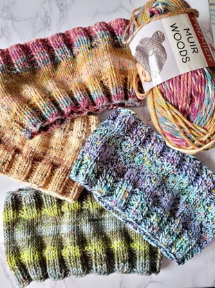 (Featured yarn is Premier Muir Woods in colorways Redwood, Forget-Me-Not, Laurel, and Chipmunk.)