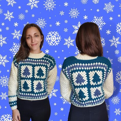 The Snowed In Pullover is the perfect winter sweater! The combination of pine tree granny squares, granny stripes, and double crochet spike stitch gives it a cozy, winter cabin feel. You can choose to use a traditional holiday colorway or something else that makes you think of winter.