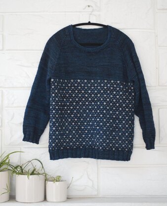 This is a raglan style sweater with a top-down construction and some stranded colourwork in the main body. Knit with Sweet Fibre’s DK- weight Merino Wool, it’s soft and warm with beautiful drape. The colours remind me of Turkish tile design, but the repeat itself reminds me of snow falling against a dark sky. Simple and stunning.