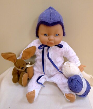 This pixie hat is a blue version of Flutterby. Instead of having three dimensional butterflies it has tiny little embroidered snowflakes in the form of white french knots. A lovely soft border is created using Plymouth Angora in Navy but if you want to make an anti allergy version knit it in a 4ply cotton instead and leave out the Angora. It frames the face beautifully and is not as heavy as a beanie and the ties make sure it stays put.