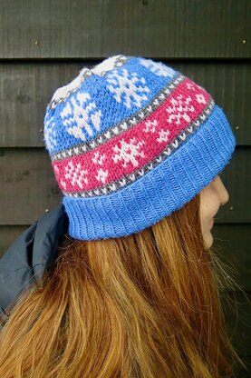Techniques: Knitting in the round, knit & purl stitches, decreasing, catching floats, weaving. Snowflake Striped Hat is a jogless pattern.
