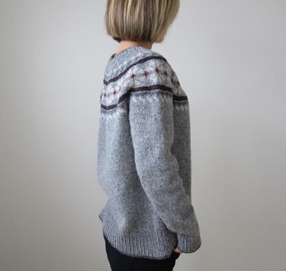 The yoke is worked first, bottom up, and then the body and sleeves are worked top down, this makes it easier to customize the length of each. This is enabled by a provisional cast on at the bottom of the yoke. Short rows are used to shape the yoke & neckline. Otherwise the sweater is knit entirely in the round. With regard to colours, each contrasting colour only touches the main colour (other than within the motif immediately above and below the flowers), so it is easier to decide on colours or alter them as you go, compared to the more intricate designs where many of the colours are side by side. I felt this would give it a clean, modern, sort of “stencilled” look. It would work really well with only 2 or 3 colours as well. It is intended to fit with anywhere from 0 to 5 inches of ease. I like my sweaters loose, so it’s shown here with about 5 inches of ease. The pattern includes optional waist shaping if you prefer a more fitted style. The sweater pictured was knit in Brooklyn Tweed