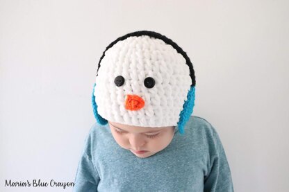This fun snowman hat is made super quick with super bulky yarn and fun embellishments added on at the end! The ear muffs for the snowman act as ear muffs and can be made in any color.
