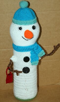 I like to have a centre piece on my table to hide little treats inside. I designed this snowman to cover an old tub. The head is removable allowing sweets and little toys to be hidden inside.