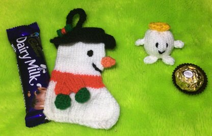 This knitting pattern is for a gift bag / stocking in the shape of a snowman 's head as well as a snowball chocolate cover.