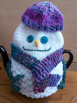 MaterialsAll sizes MC: Chunky yarn in White. I used Stylecraft Special Chunky in White. 1 (1, 2) 100g ball(s) CC1: Chunky yarn in Purple Mix. I used Noro Kogarashi. 25g Approx CC2: Chunky yarn in for stick arms. I used Sirdar Softspun Chunky 10g Approx CC3: Chunky yarn in yellow or orange for the carrot nose. 2g at most. You could use DK or Aran weight double stranded for any of the colours used to knit the cozies that works to the same tension/gauge. (sts/rows per inch/cm)