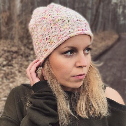 The hat is knitted bottom up and you can choose between two brims. The following techniques are also included: knitting, purling, knitting in the round, yarn overs, decreases, German Twisted Cast On (for ribbed cuff).