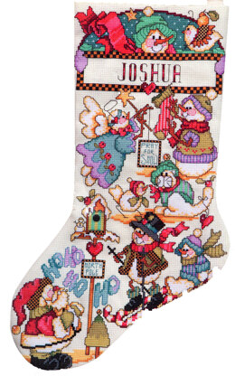 Designed by: Barbara Baatz Hillman. A Busy HoHoHo Kind of Season! Whether sledding, skating or busy with holiday preparations, these snow "flakes" are caught up in a heart-cooling festive mood. It's a sure sign that snow and Santa will fly at the North Pole. How cold can it get? This design is sure to warm the heart of the receiver. It is just the right size for delivering a host of holiday treats and gifts.