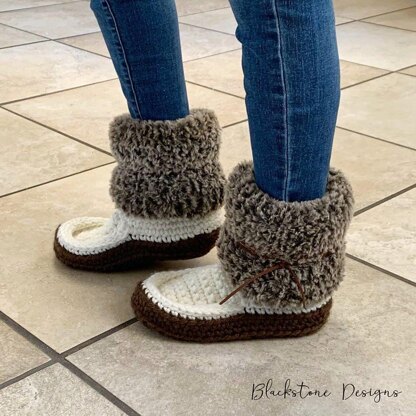 These slippers mimic the popular moccasin boots! They have a mid-calf shaft, fur cuffs, and a cute leather cord tie! They are super warm and cozy!