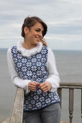 Snowstar is knitted from the bottom up, beginning with a few rounds of 'purl-when-you-can'. The armholes and front neck are steeked, then the sleeves are knitted from the top down with short row sleevecaps. Increases and decreases in the cowl collar create a ruffled look.