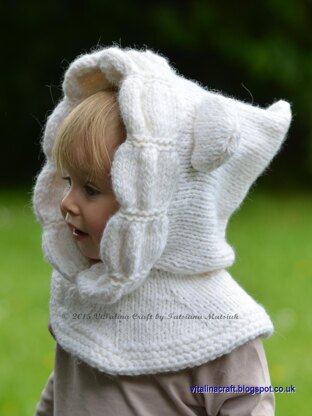 This pattern is for my Snowy Bear Hood. It is a stylish and comfy accessory for cold weather. It is designed to keep you or your little one away from wind and cold. Snowy Bear Hood is quick and fancy project. It is knitted with super bulky wool yarn in white colour. The brim is knitted sideways and then stitches picked up around for body of the hood. After body is completed the stitches picked up for collar which is knitted in the round. The ears are knitted separately and then attached to the hood.
