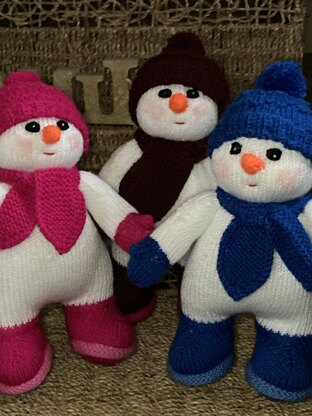 Snuggle the Snowman stands at 13 inches/34cms (Aran weight) or 10 inches/26 cms (Double Knit weight). He/she has boots and mittens knitted on and there is a choice of earflap hat and sweater or bobble beanie and scarf. Have fun choosing your own colour combinations.