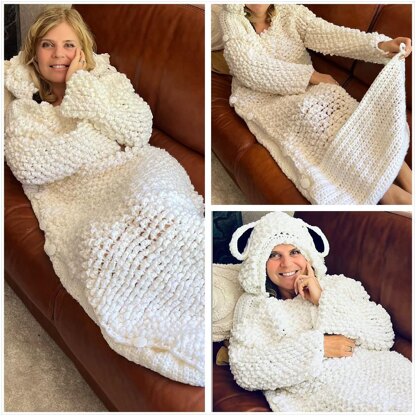 BAA BAA WHITE SHEEP ... :) This sheep blanket is the perfect example of coziness. It mimics the warmth and comfort of snuggling up to a real sheep! It delivers instant warmth and relaxation, making it perfect for chilly nights and lazy lounging on the couch. The sheep like stitch design adds a touch of whimsy and charm, making it not just very cozy but also irresistible cute. A must have for anyone who loves sheep and feeling snug. The bottom can be closed by the big buttons but can also be flipped to the back to open up for easy moving around. The pattern has a step by step written and photo tutorial. AND.... if you need any additional help: I'm always available to help. Just mail me (address is in the pattern) and you will get an answer within 12 hours or less.