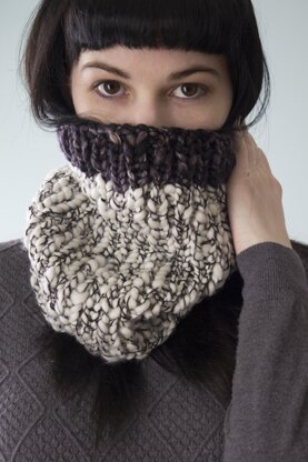 This pattern includes two versions- one mostly white and one mostly black. You can get both versions using one skein of each color, or make a solid cowl with just one skein. The version shown in black is a little longer, for extra snugglability.