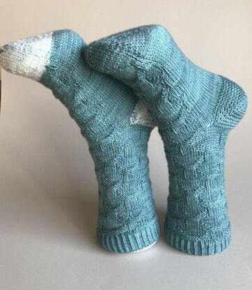 An all over textured sock which makes for an interesting knit. Paired with a garter stitch short row heel and a star toe. Sock It Up with alternative coloured heels and toes, or just keep it plain. This top down ankle sock can be knit using Magic Loop, two circular needles or on double pointed needles.
