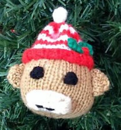 This knitting pattern is for a sock monkey head shaped bauble with a hat and holly.