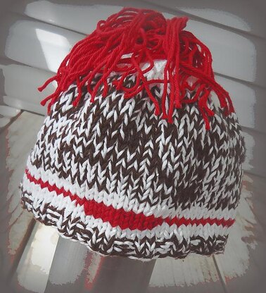 This pattern includes easy-to-follow instructions for knitting an adorable sock monkey hat. Hat is knit in the round with two strands of worsted weight yarn.