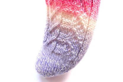 Das benötigst du: * 4-fädiges Sockengarn mit einem hellen Farbverlauf in rosa/lila oder deiner Lieblingsfarbe * Nadelspiel 2,5 * Schere * Maßband * Wollnadel