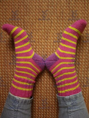 “Giggledance” is a knitting pattern for relatively thin but still warm striped wool socks with a boomerang heel. One can knit them either toe-up or top-down (both versions are included in the knitting pattern).