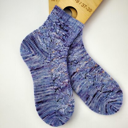 Worked in the round, Socks of Enchantment contains both cuff-down and toe-up written directions and a chart for the pattern stitch. The pattern has instructions for a short row heel, but you may substitute whatever heel you enjoy using (links included for alternatives).