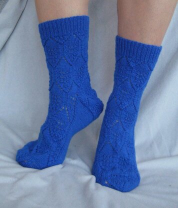 Skill Level: Intermediate; includes basic top-down sock construction, textured stitches, and chart reading Available in two sizes: child and adult.  Finished measurements are adjustable by lengthening or shortening the leg and foot. Materials:  To make socks in two sizes: Child size (48 stitches cast on) or an Adult size (72 stitches cast on) use 80 – 100 grams of 420 yards (400 m)/ 100 grams yarn and 1 Set of US 0 – 1½ (2 – 2.5 mm) DPNs (or size needed to obtain gauge of 28 stitches & 41 rows per 4 inches (10 cm) in Stockinette stitch).  Alternatively, you can use 100 grams of 270 yards (250 m) / 100 grams yarn and 1 Set of US 2½ (3 mm) DPNs (or size needed to obtain gauge of 22 stitches & 32 rows per 4 inches (10 cm) in Stockinette stitch) to knit adult size socks using Child size (48 stitches cast on) charts.  Stitch markers (optional).  Tapestry needle.