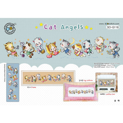 Cat Angels - cross stitch pattern or kit. SODAstitch SO-G-118 Chart. - W 308count × H 61count - Contains color chart with symbols and Floss conversions for DMC, ANC and Yeidam. Kit. - Floss Color 25 - Full Stitch count W308 count × H61 count - Whole pattern finished size: 56cm × 11cm(14ct) -