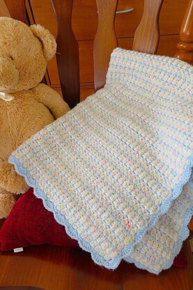 This sweet baby blanket is made with Lion Brand Baby Soft, a lightweight #3 yarn that gives the fabric a gentle drape and soft, comforting feel. It’s fully machine washable and dryable, perfect for everyday snuggles and easy care. The pattern also works beautifully with other #3 lightweight yarns. The design blends two soothing textures: soft, airy cluster‑stitch rows in variegated yarn and woven moss‑stitch rows in blue. The yarns are carried up the side, so there’s no cutting or weaving in ends between rows—just smooth, uninterrupted stripes of color and texture.
