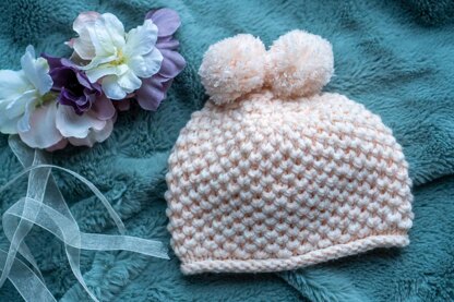 This fun and cuddly children’s hat is springy in texture and in style! It’s soft enough for even the most sensitive heads and the rolled brim is comfortably stretchy in a wide range of sizes. With its surprisingly simple stitch pattern and in-the-round construction, it’s also a joy to knit. Knit with two strands held together, it’s easy to jazz up the hat with fun color combinations and variegated pom-poms to make it your own. The soft and springy nature of the stitch pattern is amplified by the Berroco Comfort DK yarn. If you use a different yarn, be sure to find one with a similar weight per length to keep the texture.