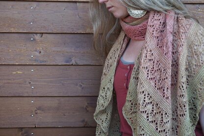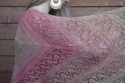 The Solar Flare Shawl is at the beginning a squared-shaped shawl knitted in the round from the middle to the edge with a garter stitch. Next, it changes to a shawl with a center spine on two opposite sides of the square, while working the lace and garter stitch flat in rows.