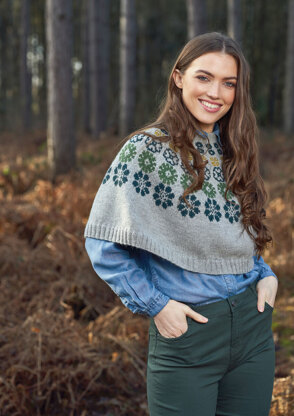The colourful Solar mini poncho is a fun project for trying out two color knitting. A mix of updated folkloric floral motifs work their way up to the top of this striking coverup designed by Martin Storey in Alpaca Soft.