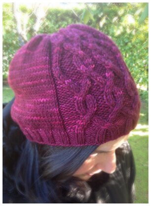 Worked in the round from the brim upward, the instructions are fully written and charted. Want it slouchier? Just work the ribbed brim for an extra inch or so before starting the cables.