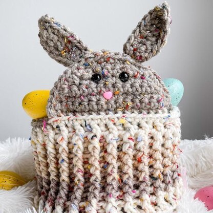 A super cute Easter Bunny basket quickly made in a bulky weight self striping yarn. Complete with faux fur pom pom for the bunny tail!