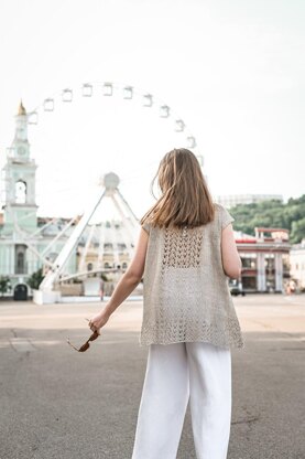 “Song of the wind” top is worked from the bottom up in one piece in the round. At armhole level, work is divided into Front and Back, which are finished separately, shoulder seams are joined using the three-needle bind-off method.