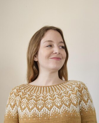 Sonrae is named after a country store I used to visit when I was a child. This top down sweater is worked seamlessly and in the round. The stranded yoke is worked and short rows shape the neckline. The body and sleeves are separated, worked top to bottom, and finished with a ribbed hem and colorwork cuffs. The yoke chart is easy to follow and calls for just two colors per row. Sport or fingering weight yarn. Designed to be worn with 3-6” / 7.5-15 cm positive ease. Shown with 5” positive ease.