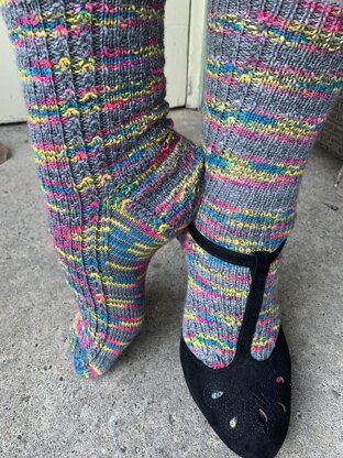 These socks are worked cuff down with an alternating broken rib and accent stitches. A patterned heel flap and toe adds some zing to an otherwise practical pattern.