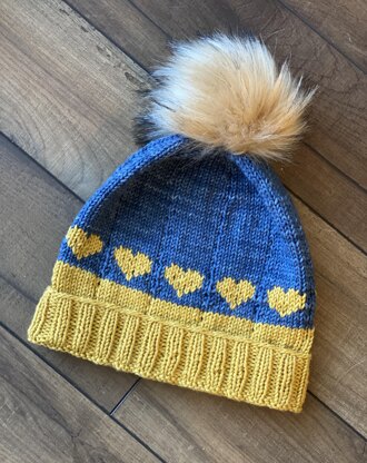 This hat comes in 5 sizes and incorporates a rib brim with a simple rib body with lots of ease in it. The hearts can be left out completely if desired if stranding isn’t your thing. Without them it becomes the Ukranian flag. Model hat is Largest size, worked in Malabrigo Rios. Suggestions for other brands of yarn are included.