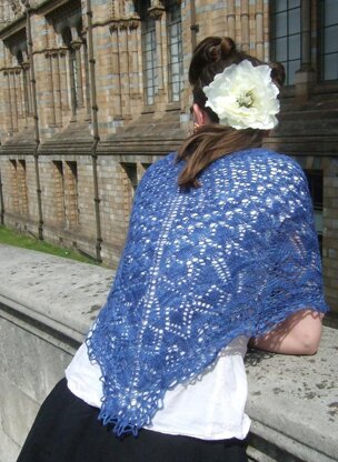 This shawl is knit top-down, back and forth in one-piece. It has a cabled top band and intricate lace panelling expanding to a scalloped edging with crocheted cast-off. Instructions are both written and charted. This pattern is rated as challenging.