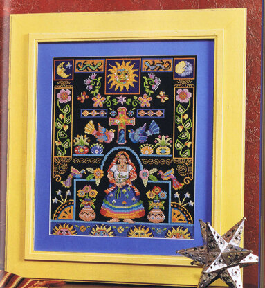 By Linda Gillum. Our cheerful South of the Border Sampler will take you back to sunny Mexico and all of its lovely crafts and culture. Traditional Mexican motifs run throughout this detailed sampler and the use of black fabric makes it striking design to decorate your home.