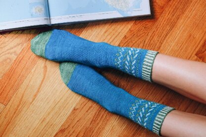 These socks are worked from the cuff down, beginning with a stranded two-color rib. The contrasting heel is worked as a slip stitch heel flap, but other heel methods could easily be used instead, and the contrasting toe is worked in staggered decreases for a rounded shape.