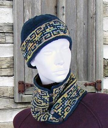 A solid color, or semi-solid color, paired with a painted colorway is a great starting point for this set. One version of the hat features a fold-up brim that’s buttoned at the side, though you can always omit the buttons and sew the ends of the band together, but why not show off the same buttons that you used for the cowl?